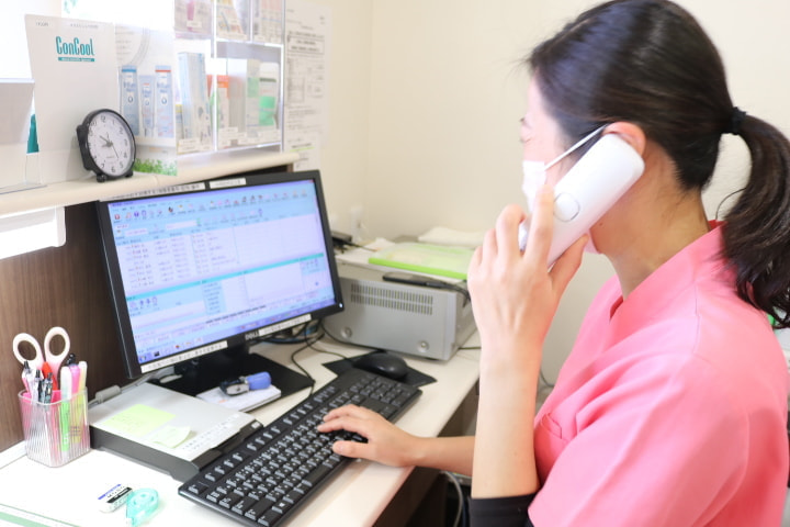 診察当日は、保険証をお持ちになってご予約時間にお越しください。 受付スタッフに保険証をご提示後、問診票をお渡ししますので、お待ちいただく間にご記入お願いします。車イスを当院で準備しておりますので、ご利用の際はお声がけ下さい。